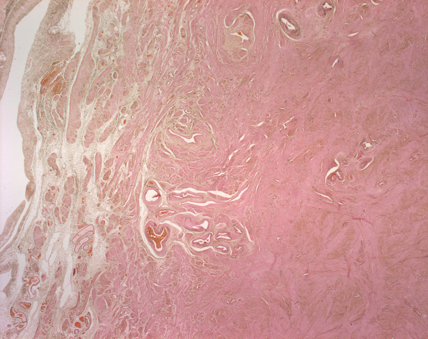 Man erkennt, dass das Endometrium am oberen Schnittrand flacher wird (Übergang!) und die Uterusdrüsen teilweise zu großem Lumen aufgeweitet sind.